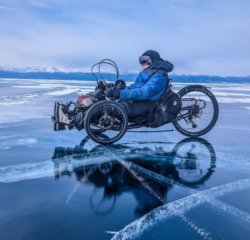 We moved across the lake in different ways: I rode a hand-trike, a new Inspired Cycle Engineering (ICE) machine, while the others walked, pedalled a mountain bike, or, when the ice allowed (rarely), skated. The ICE trike was an enabler for a journey that once would have seemed entirely out of reach. I sensed the delicious taste of freedom. The energy and beauty of the ice tingled my senses and penetrated deep within. I sat quietly on the trike, in a peaceful space, and listened to the millenia-old waters boom in haunting echos beneath the lake’s vast, frozen surface…the ice, in all its eminence, moved me to tears.